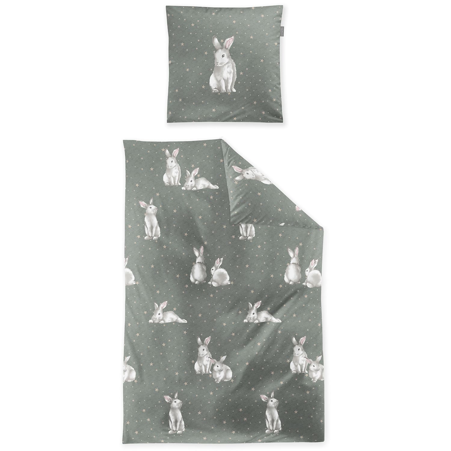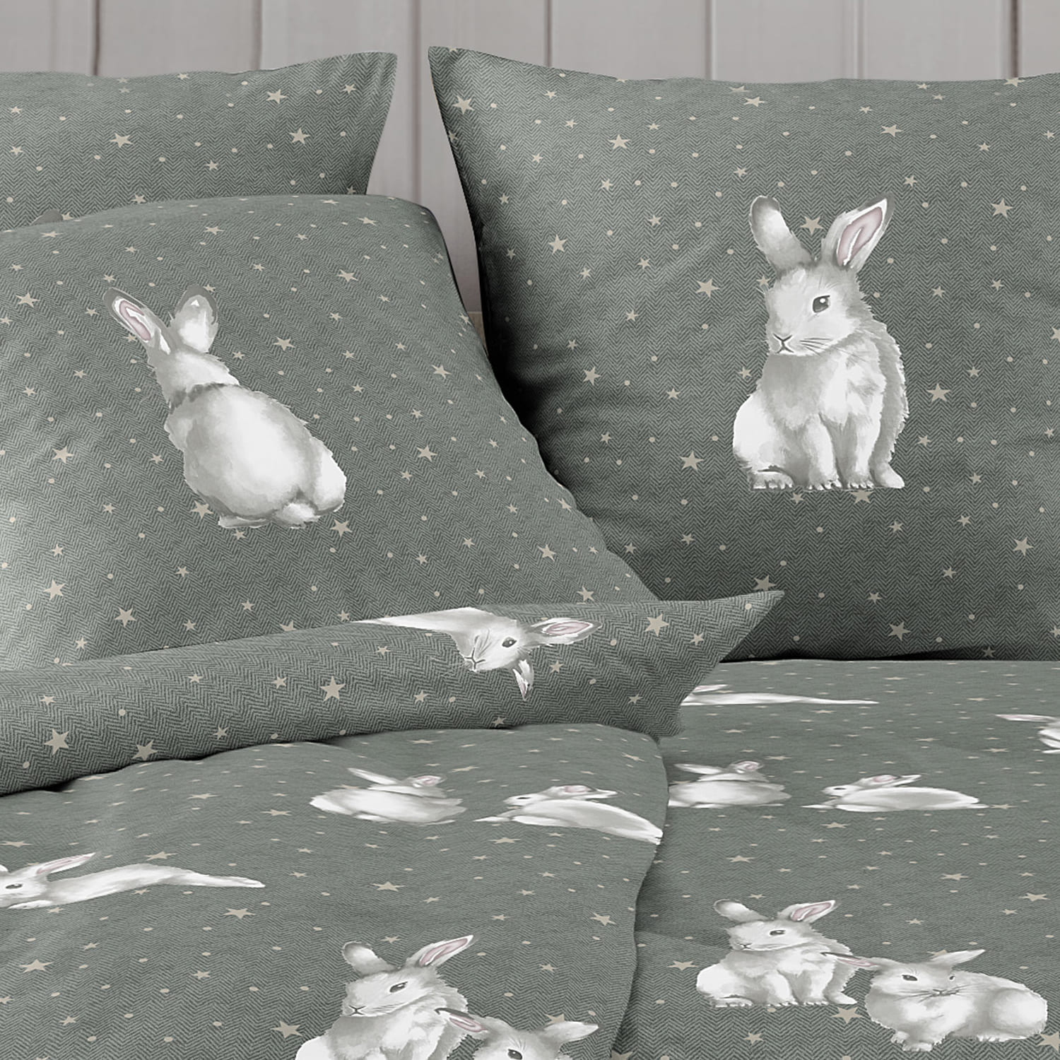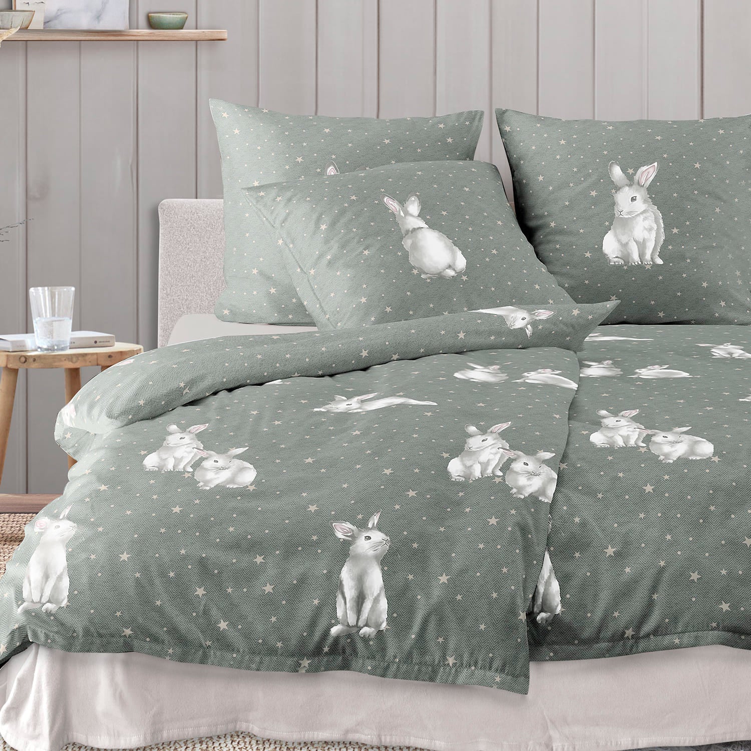 - Winterliches Design: Charmantes Dessin (8654-30) mit niedlichen Hasen und Sternen auf elegantem Salbei-Hintergrund, das eine moderne, gemütliche Wohlfühlatmosphäre schafft.
