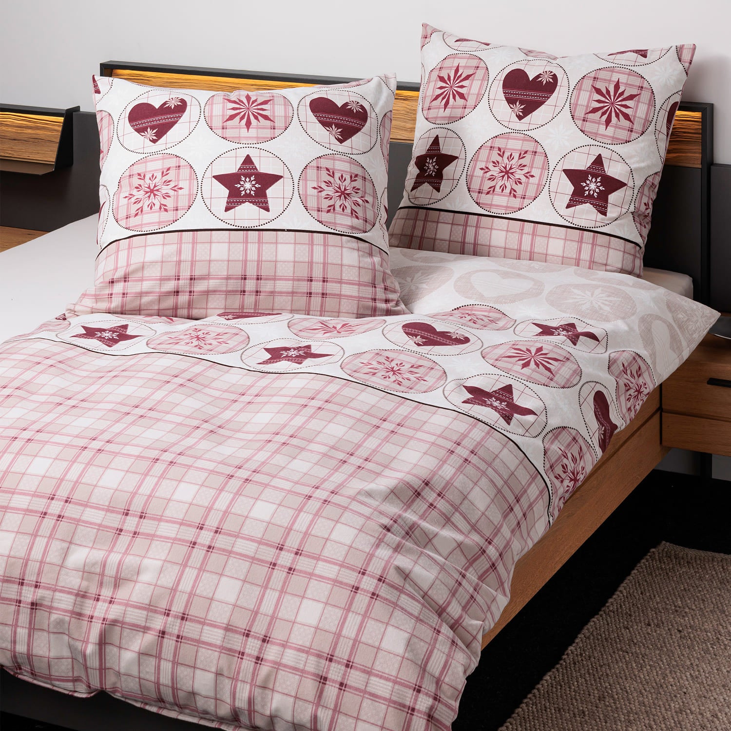 - Winterlich-festliches Design: Das charmante Dessin in Rot-Rosenholz kombiniert ein sanftes Karo-Muster mit liebevollen Motiven wie Herzen, Sternen und Schneekristallen für eine gemütliche Landhaus-Atmosphäre.