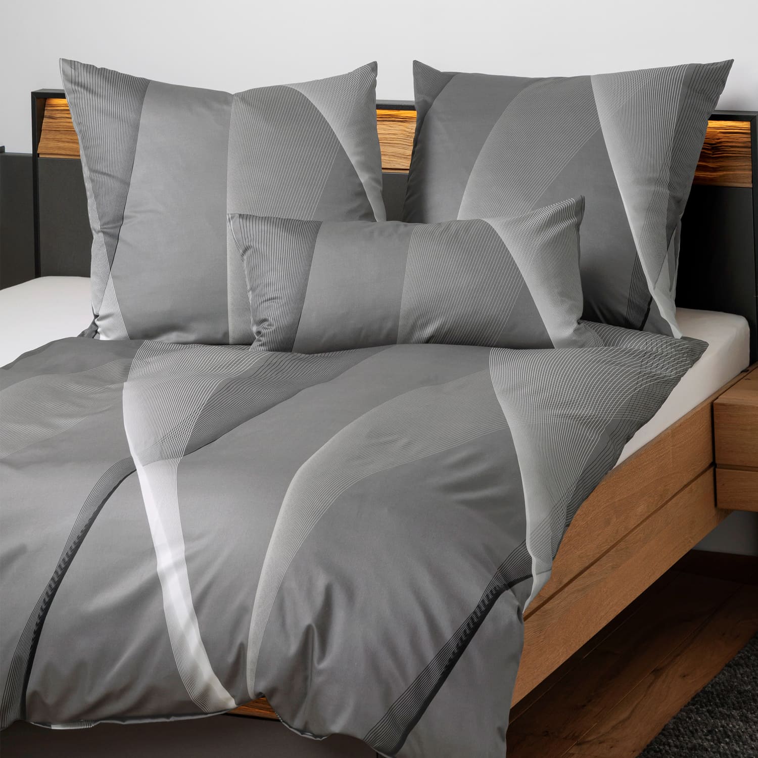 Erleben Sie die Exklusivität der Janine Mako-Satin Bettwäsche MILANO 45115. Diese Garnitur in edlen Grau- und Taupe-Tönen besticht durch ein schwungvolles grafisches Dessin und verleiht Ihrem Schlafzimmer eine zeitlose, stilvolle Note. Gefertigt aus 100 % naturreiner, supergekämmter Mako-Baumwolle, bietet dieser Mako-Satin ein Höchstmaß an Qualität und Schlafkomfort. Durch die Merzerisierung und Hochveredelung erhält der Stoff sein elegantes Seidenfinish und seinen geschmeidigen Griff. Als echtes Spitzenprodukt der Janine Kollektion garantiert er eine dichte Webkonstruktion und ist besonders atmungsaktiv und feuchtigkeitsregulierend – ideal für ein optimales Schlafklima das ganze Jahr. Die Atelierkonfektion sorgt für perfekte Passform und Formstabilität. Für eine einfache Handhabung ist die Bettwäsche mit dem Janine Markenreißverschluss ausgestattet und ist sogar für Wasserbetten geeignet.