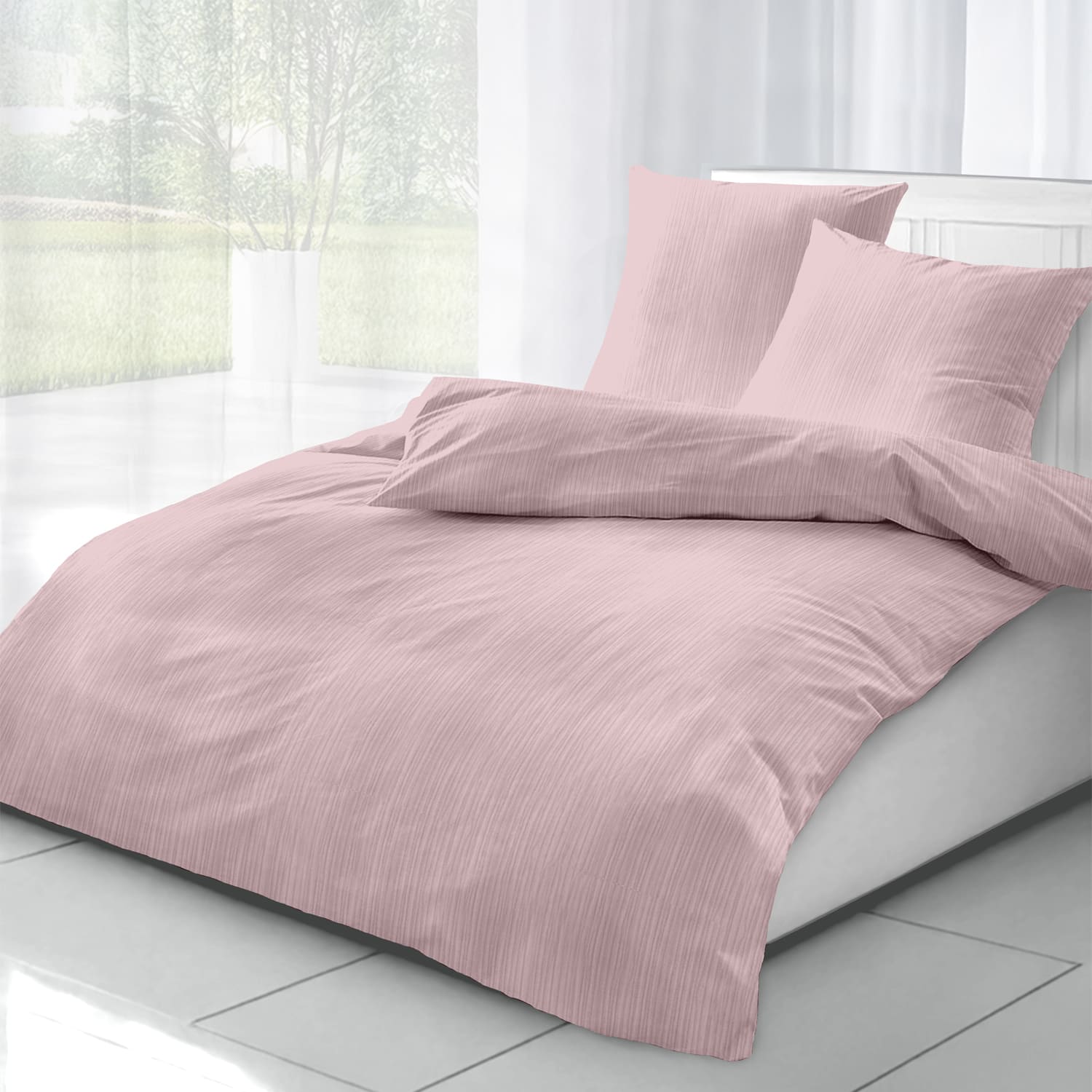 - Sanftes Design: Der zarte Roséton in Kombination mit der typischen Musselin-Struktur verleiht Ihrem Schlafzimmer eine ruhige und stilvolle Optik.